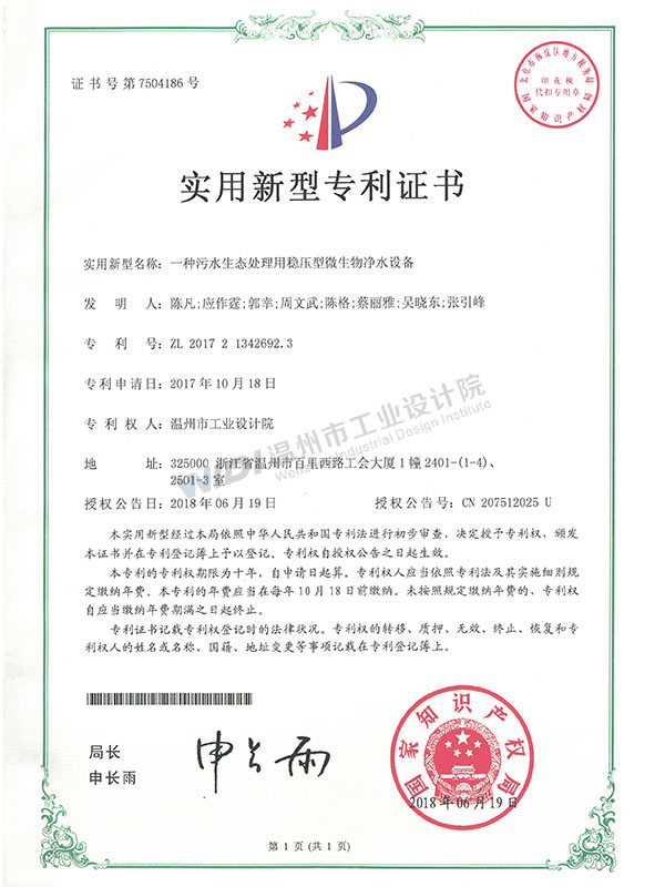 一種污水生態(tài)處理用穩(wěn)壓型微生物凈水設(shè)備證書