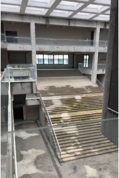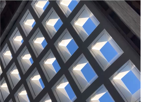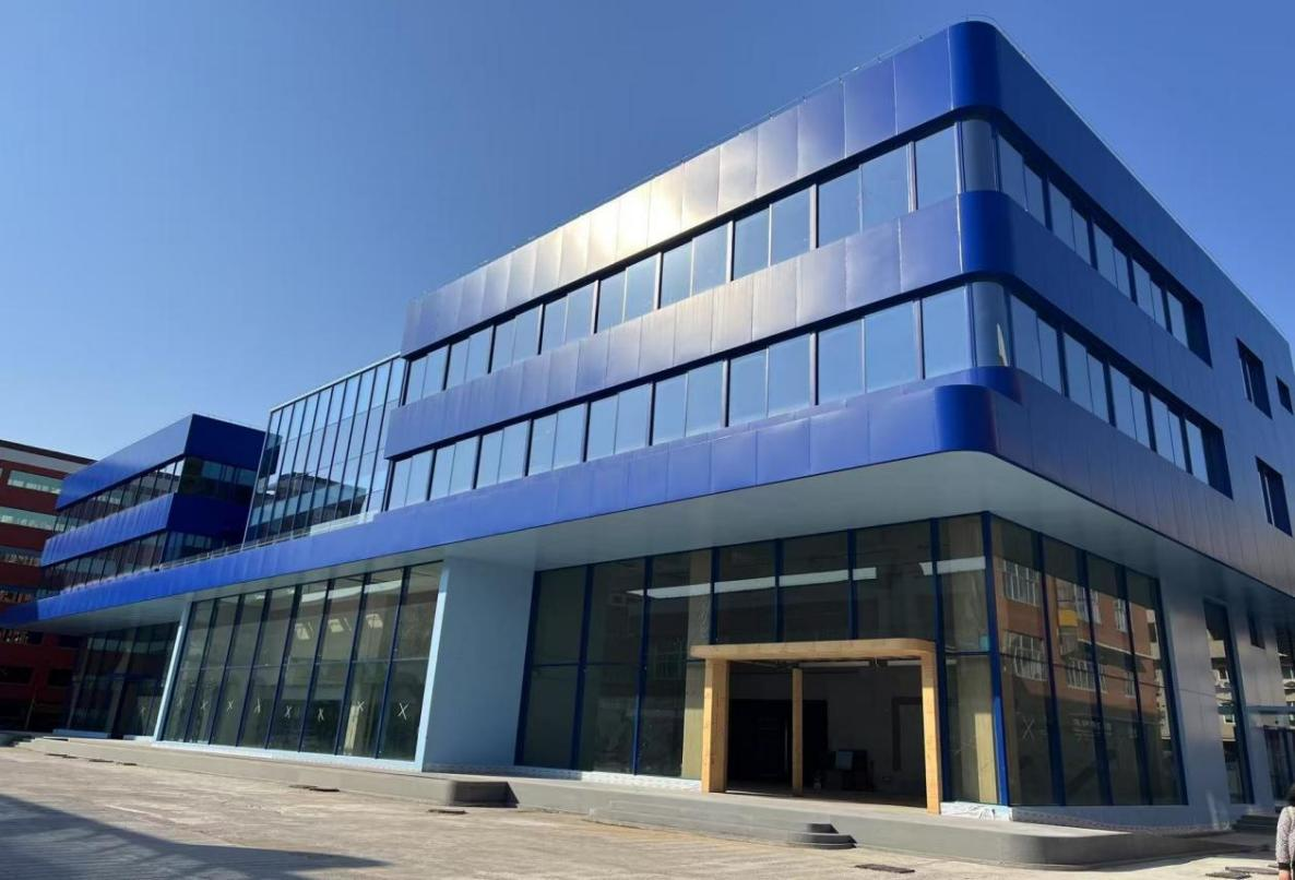 建筑美學:建筑內部空間流動活潑,以多維度的層次感與流動性喚醒豐富的空間體驗;建筑外立面采用橫向條形玻璃窗與啞光藍色鋁板交替構成,形成簡潔的現(xiàn)代韻律。同時中庭的空間構架在光影交織中勾勒出虛實交錯的幾何敘事。